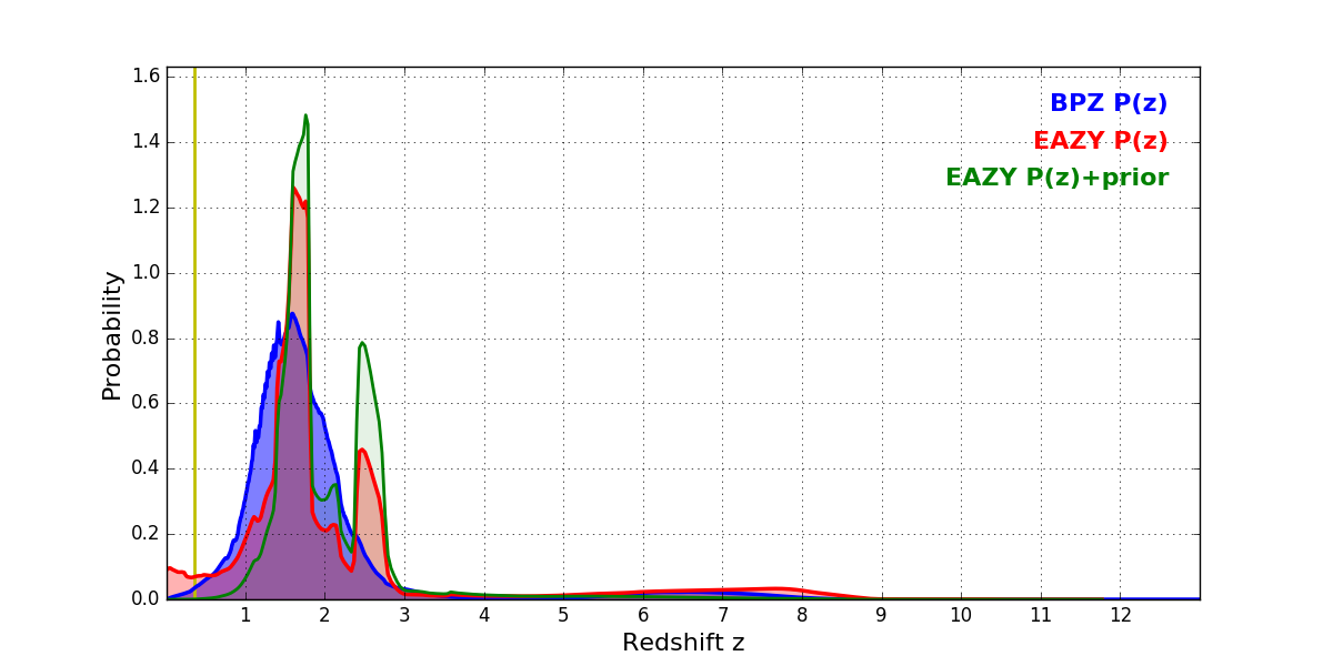 In P(z) plots: Yellow lines mark the cluster redshift z = 0.356,