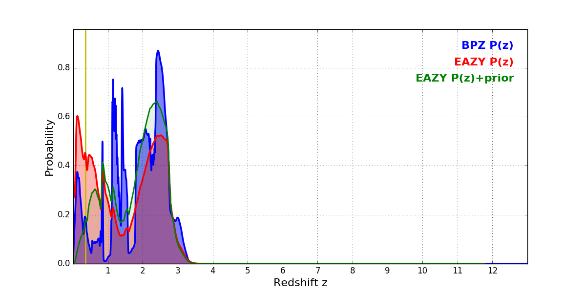 In P(z) plots: Yellow lines mark the cluster redshift z = 0.356,