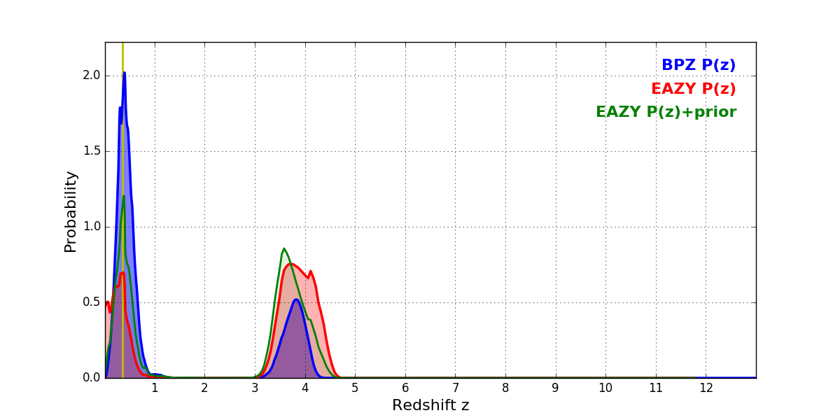 In P(z) plots: Yellow lines mark the cluster redshift z = 0.356,