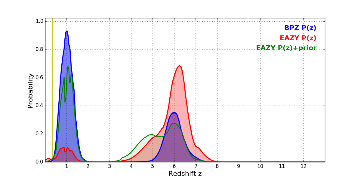 In P(z) plots: Yellow lines mark the cluster redshift z = 0.356,