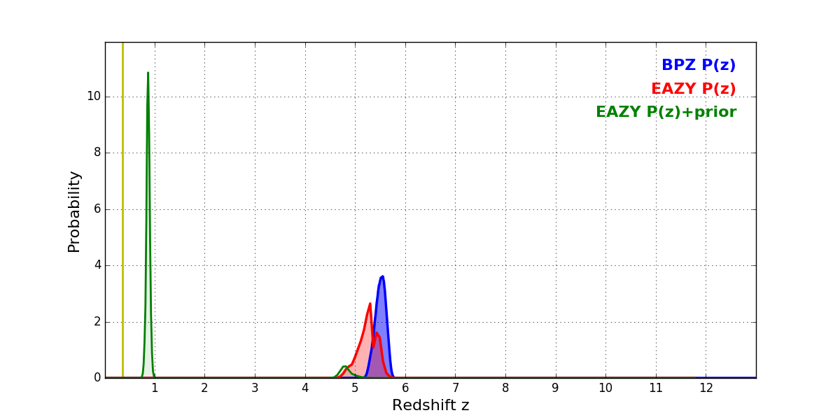 In P(z) plots: Yellow lines mark the cluster redshift z = 0.356,