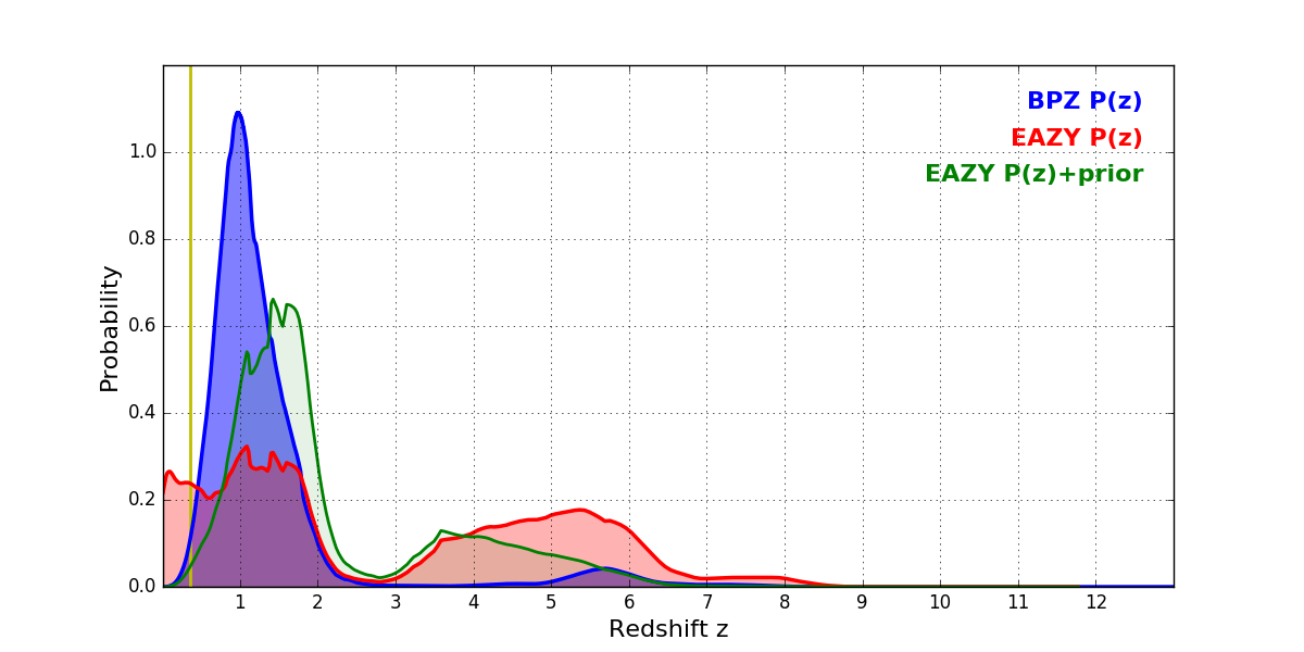In P(z) plots: Yellow lines mark the cluster redshift z = 0.356,