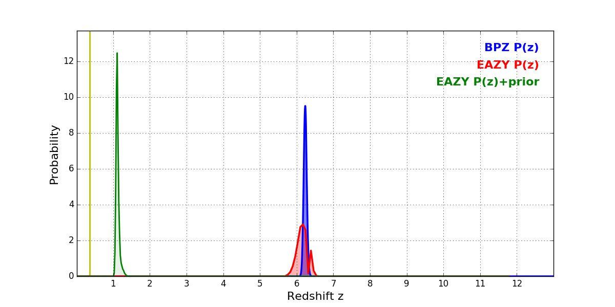 In P(z) plots: Yellow lines mark the cluster redshift z = 0.356,
