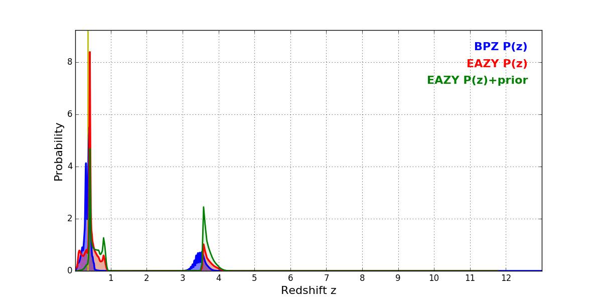 In P(z) plots: Yellow lines mark the cluster redshift z = 0.356,