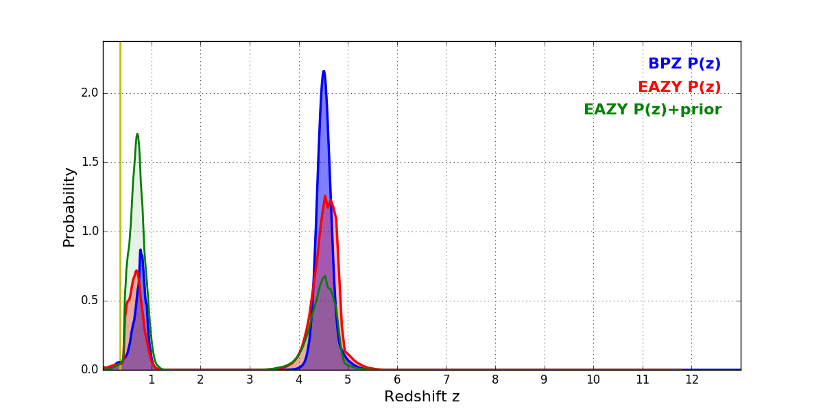 In P(z) plots: Yellow lines mark the cluster redshift z = 0.356,