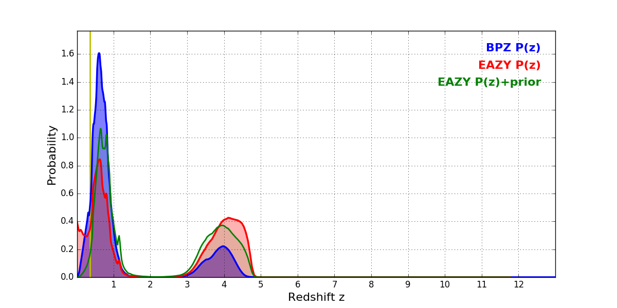 In P(z) plots: Yellow lines mark the cluster redshift z = 0.356,