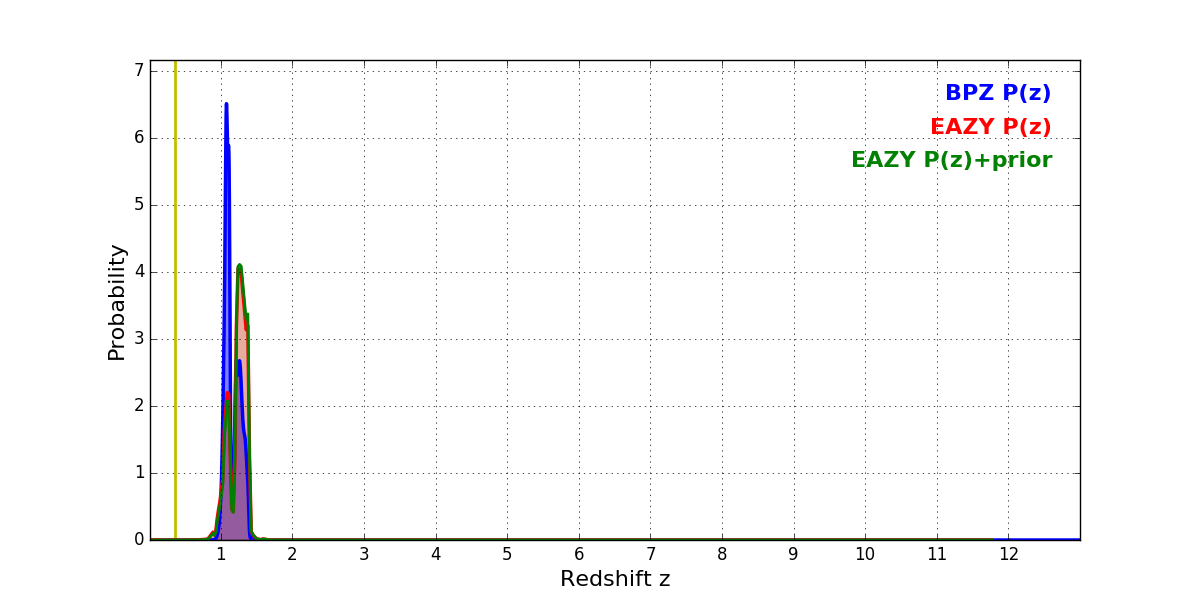 In P(z) plots: Yellow lines mark the cluster redshift z = 0.356,