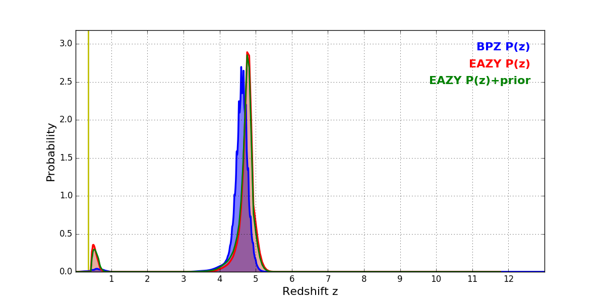 In P(z) plots: Yellow lines mark the cluster redshift z = 0.356,