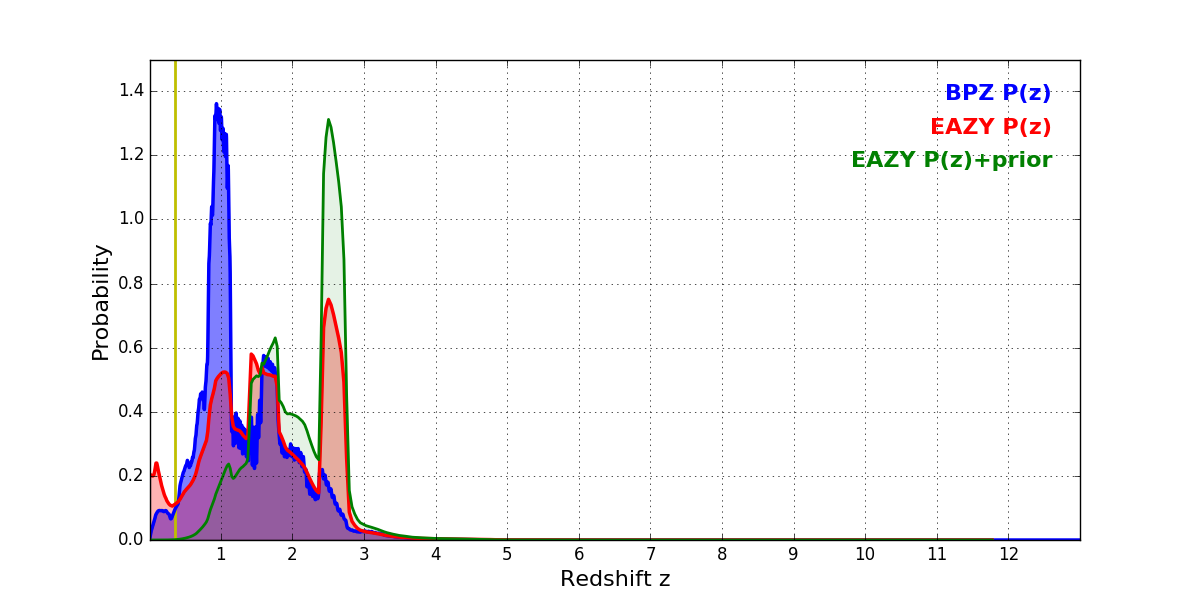 In P(z) plots: Yellow lines mark the cluster redshift z = 0.356,