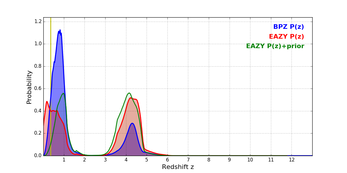 In P(z) plots: Yellow lines mark the cluster redshift z = 0.356,
