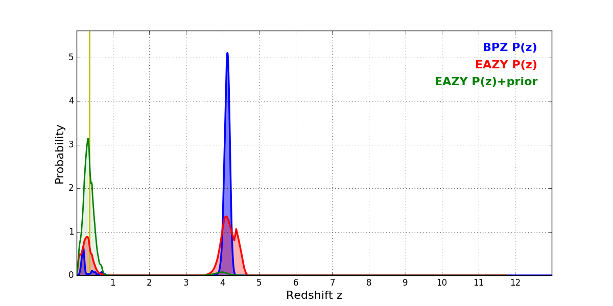 In P(z) plots: Yellow lines mark the cluster redshift z = 0.356,