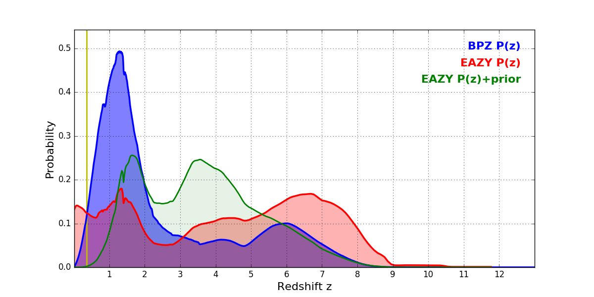 In P(z) plots: Yellow lines mark the cluster redshift z = 0.356,