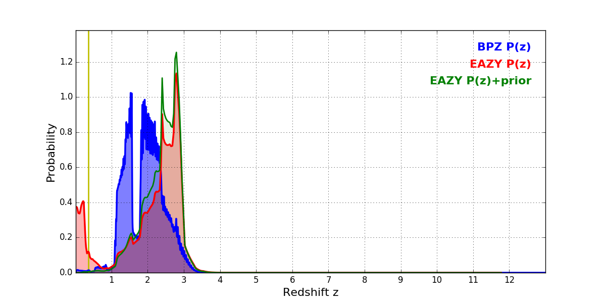 In P(z) plots: Yellow lines mark the cluster redshift z = 0.356,