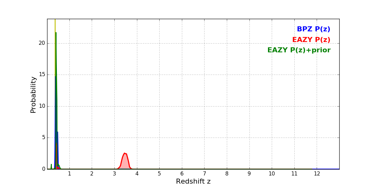 In P(z) plots: Yellow lines mark the cluster redshift z = 0.356,