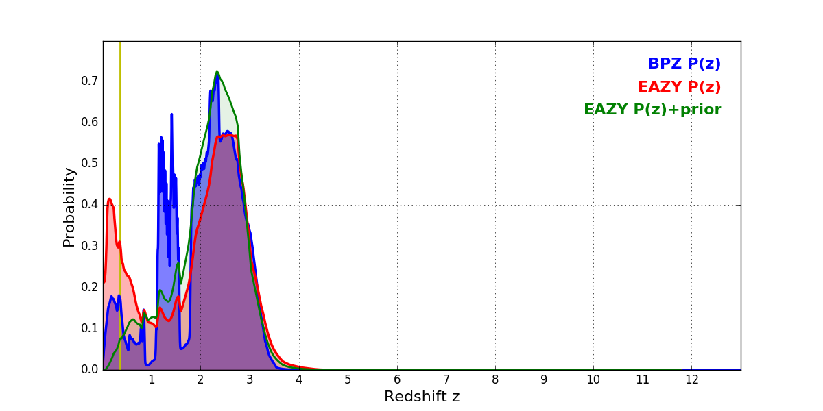In P(z) plots: Yellow lines mark the cluster redshift z = 0.356,