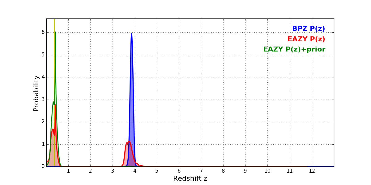 In P(z) plots: Yellow lines mark the cluster redshift z = 0.356,