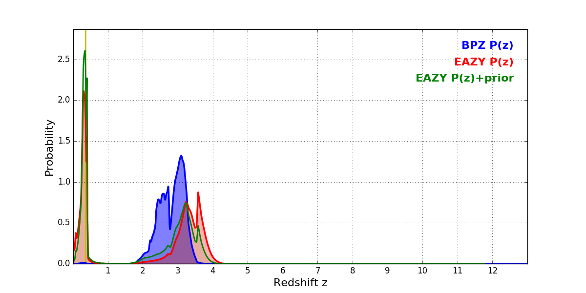 In P(z) plots: Yellow lines mark the cluster redshift z = 0.356,