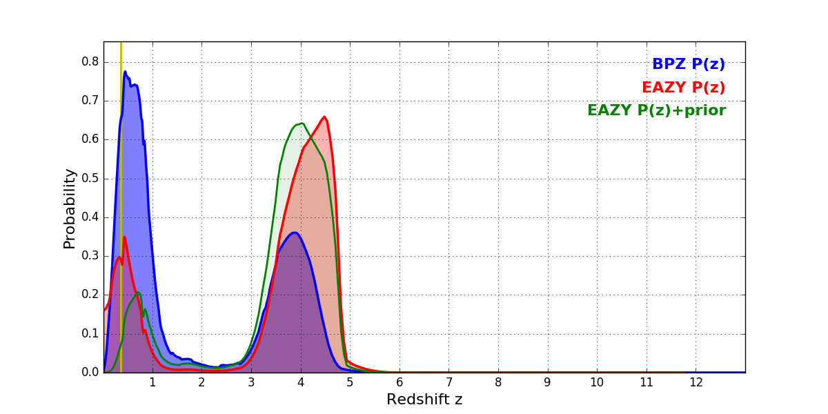 In P(z) plots: Yellow lines mark the cluster redshift z = 0.356,