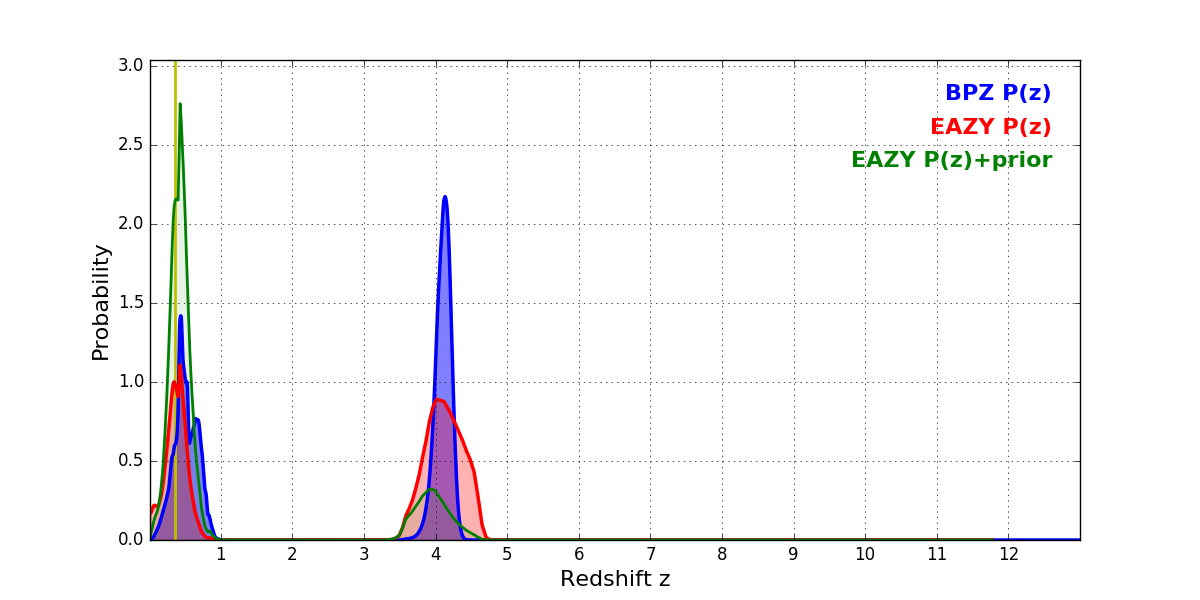 In P(z) plots: Yellow lines mark the cluster redshift z = 0.356,