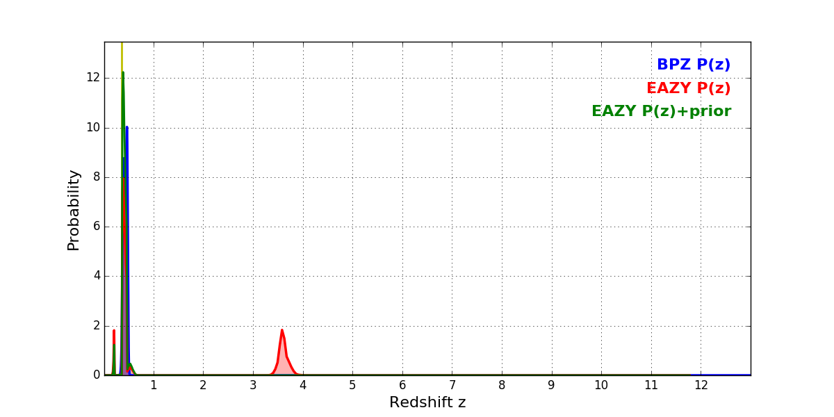 In P(z) plots: Yellow lines mark the cluster redshift z = 0.356,