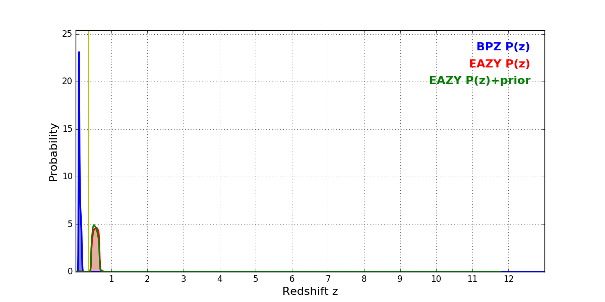 In P(z) plots: Yellow lines mark the cluster redshift z = 0.356,
