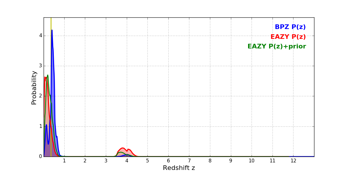 In P(z) plots: Yellow lines mark the cluster redshift z = 0.356,