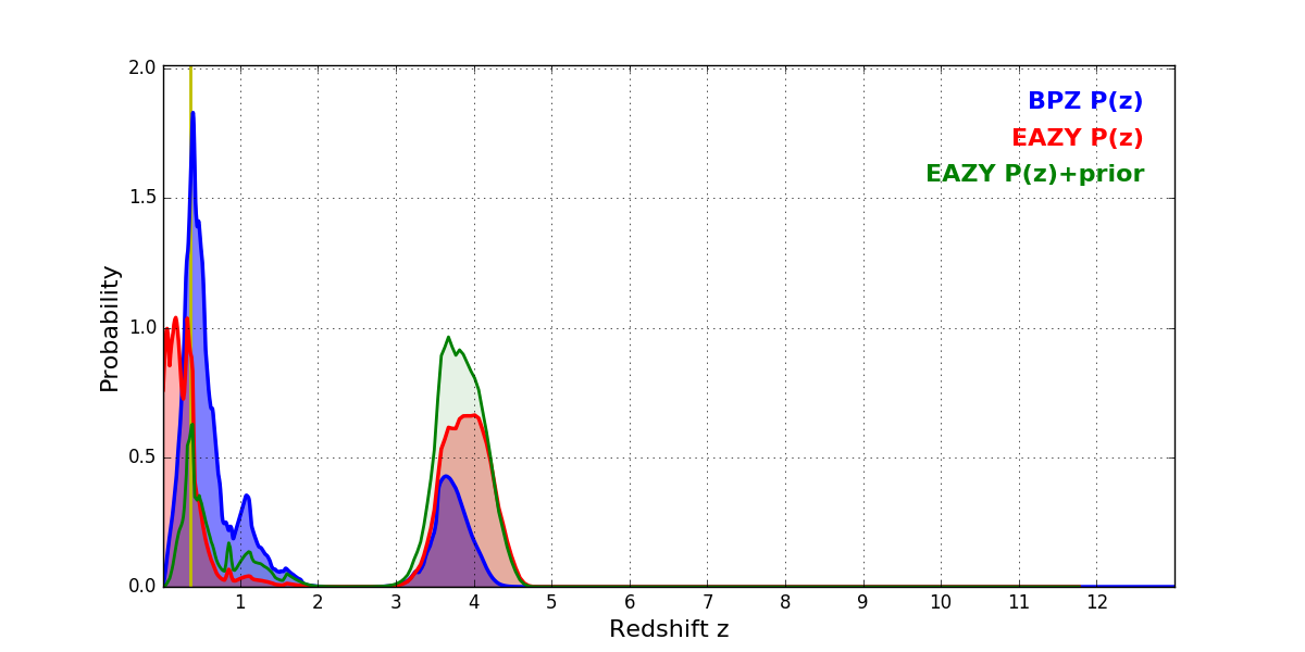 In P(z) plots: Yellow lines mark the cluster redshift z = 0.356,