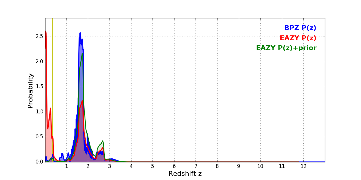 In P(z) plots: Yellow lines mark the cluster redshift z = 0.356,