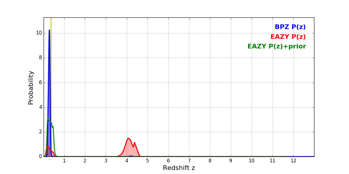 In P(z) plots: Yellow lines mark the cluster redshift z = 0.356,