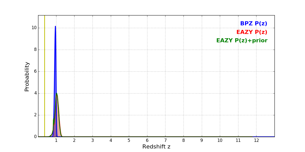 In P(z) plots: Yellow lines mark the cluster redshift z = 0.356,