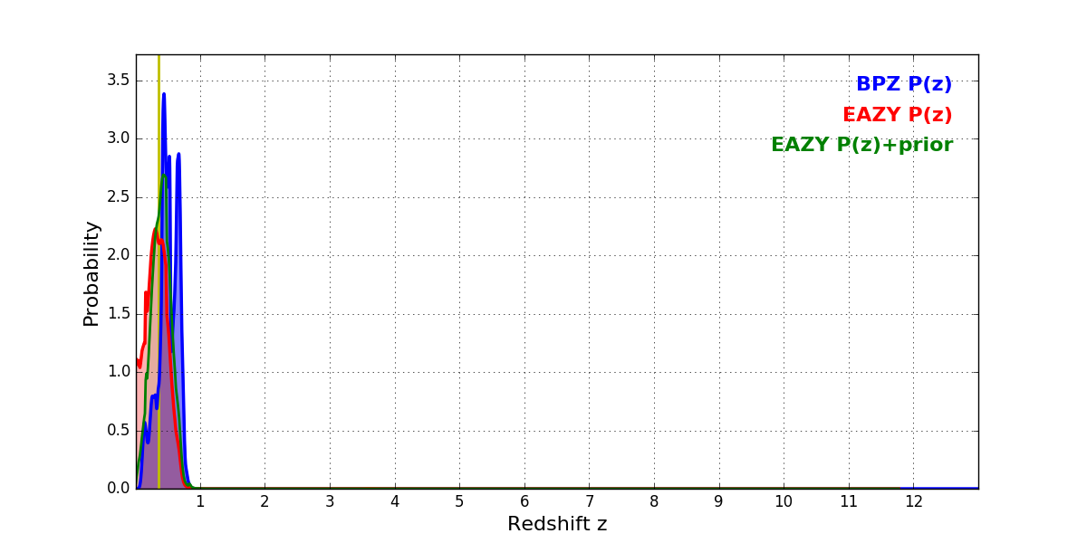 In P(z) plots: Yellow lines mark the cluster redshift z = 0.356,
