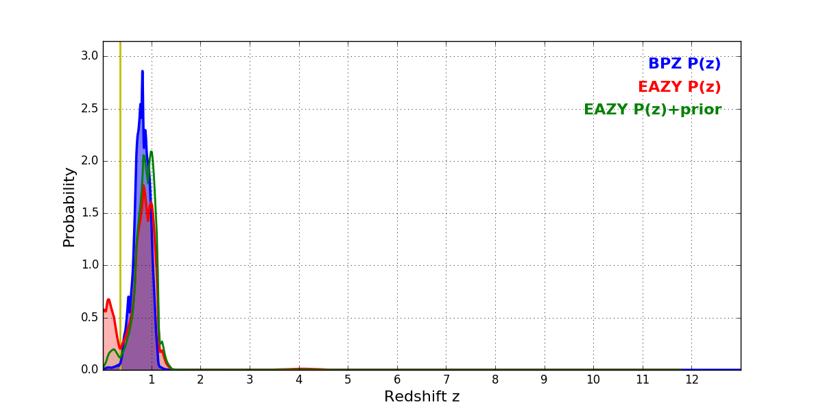 In P(z) plots: Yellow lines mark the cluster redshift z = 0.356,
