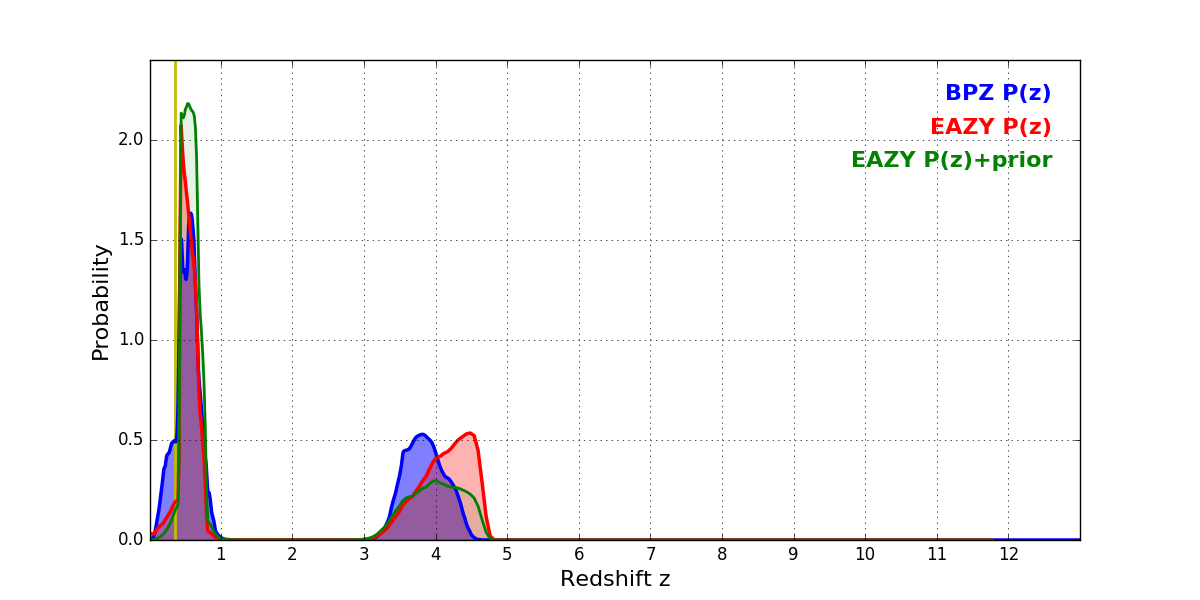 In P(z) plots: Yellow lines mark the cluster redshift z = 0.356,