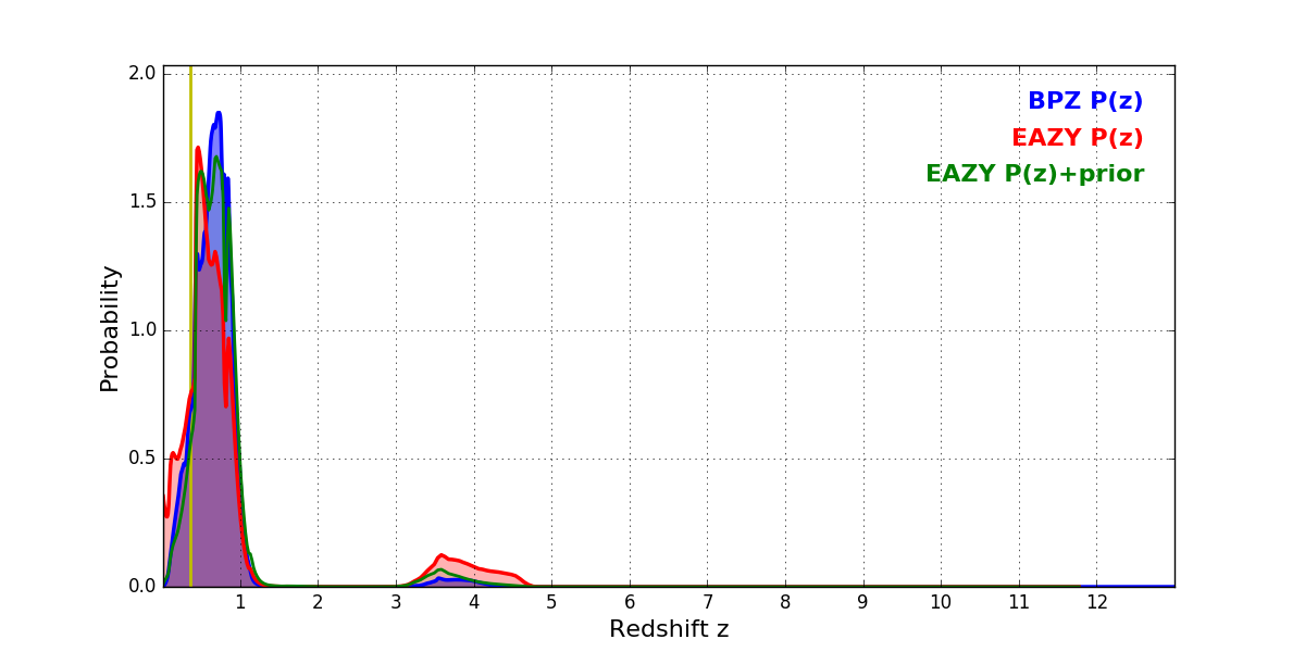In P(z) plots: Yellow lines mark the cluster redshift z = 0.356,