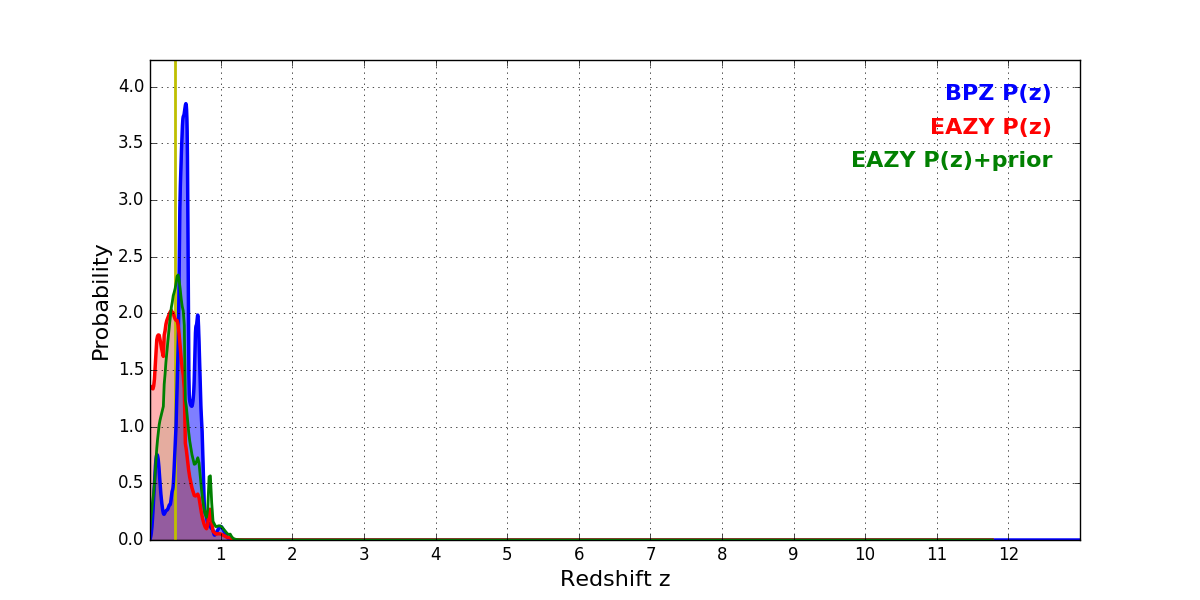 In P(z) plots: Yellow lines mark the cluster redshift z = 0.356,