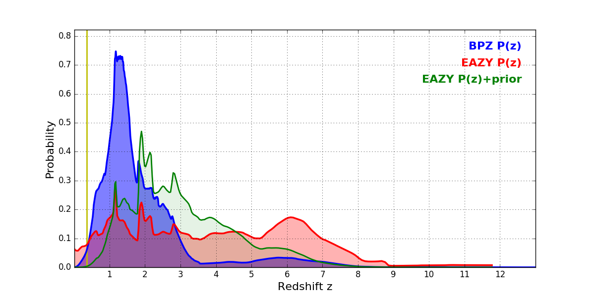 In P(z) plots: Yellow lines mark the cluster redshift z = 0.356,