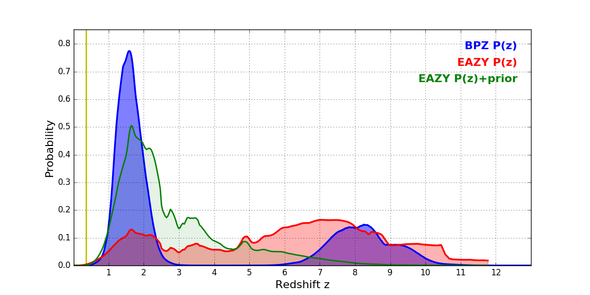 In P(z) plots: Yellow lines mark the cluster redshift z = 0.356,