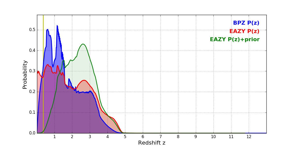 In P(z) plots: Yellow lines mark the cluster redshift z = 0.356,