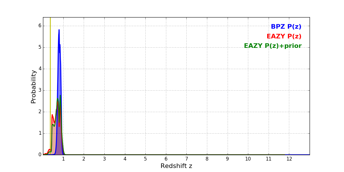 In P(z) plots: Yellow lines mark the cluster redshift z = 0.356,