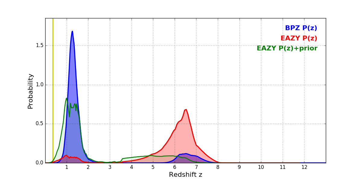 In P(z) plots: Yellow lines mark the cluster redshift z = 0.356,