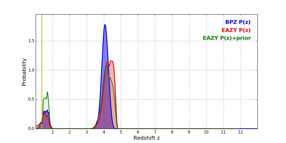 In P(z) plots: Yellow lines mark the cluster redshift z = 0.356,