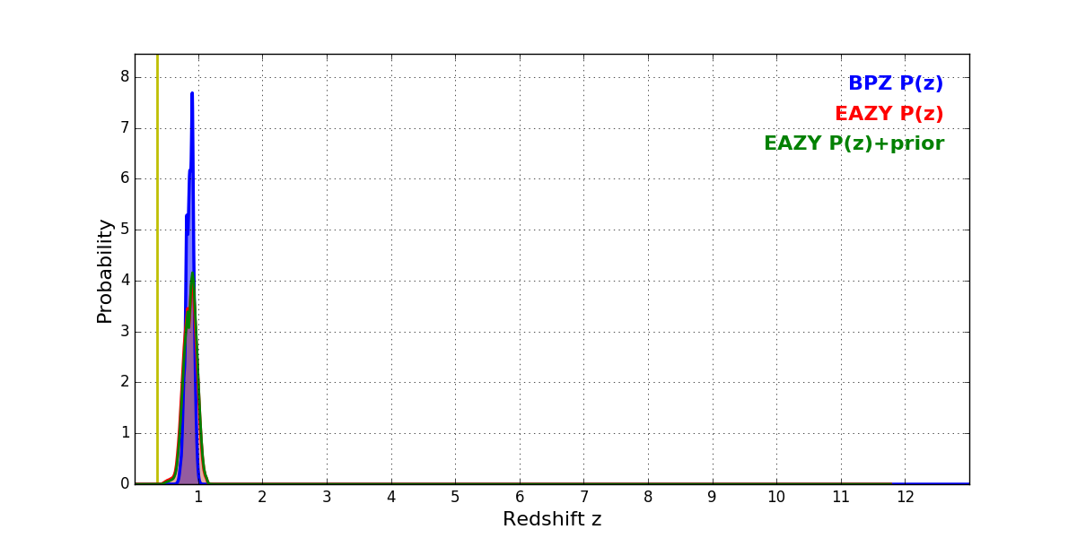 In P(z) plots: Yellow lines mark the cluster redshift z = 0.356,