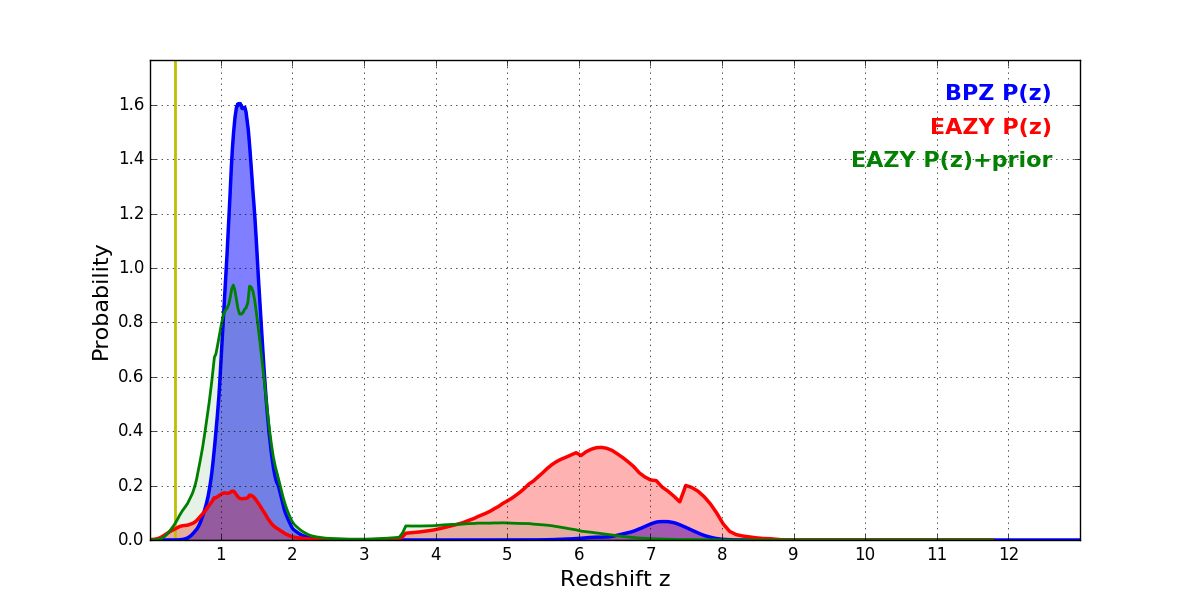 In P(z) plots: Yellow lines mark the cluster redshift z = 0.356,