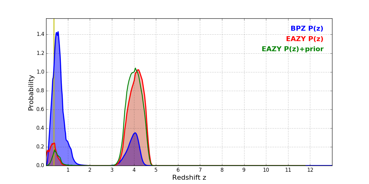 In P(z) plots: Yellow lines mark the cluster redshift z = 0.356,