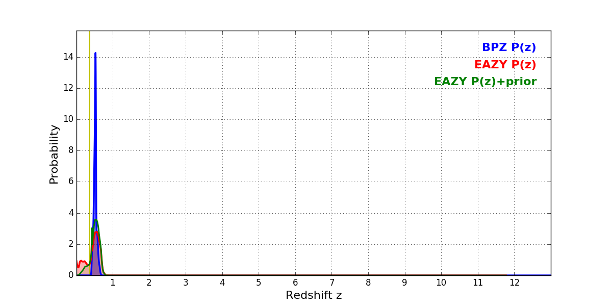 In P(z) plots: Yellow lines mark the cluster redshift z = 0.356,