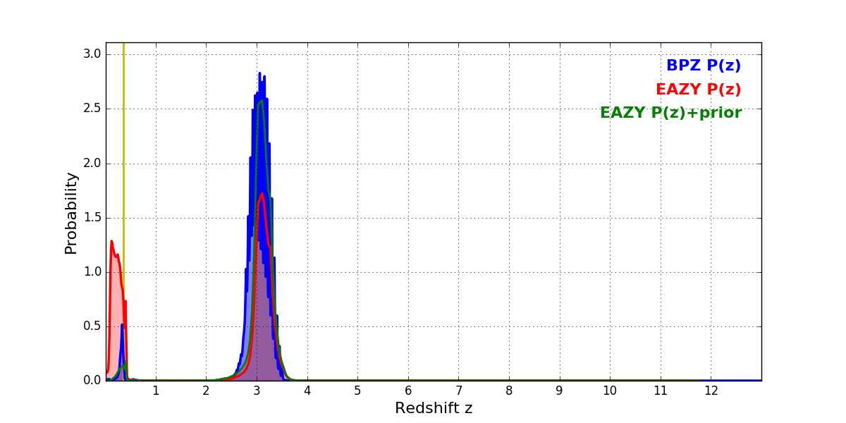 In P(z) plots: Yellow lines mark the cluster redshift z = 0.356,