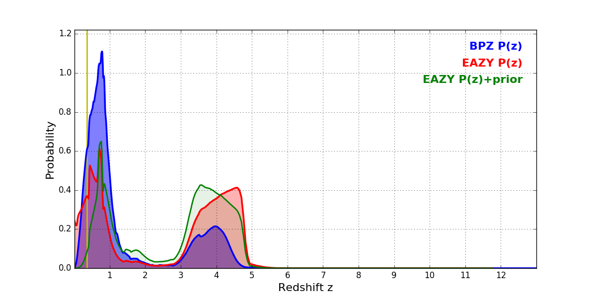 In P(z) plots: Yellow lines mark the cluster redshift z = 0.356,