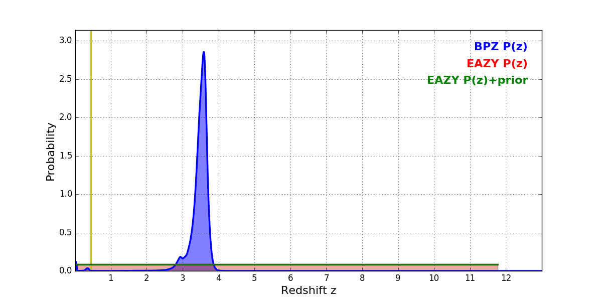 In P(z) plots: Yellow lines mark the cluster redshift z = 0.443,
