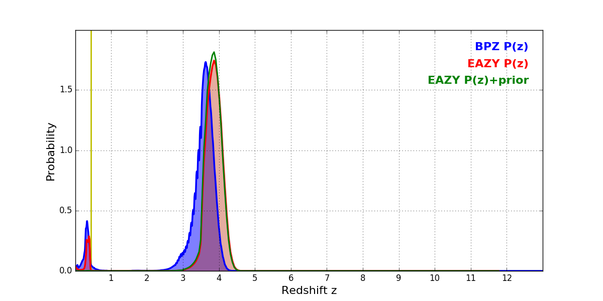 In P(z) plots: Yellow lines mark the cluster redshift z = 0.443,