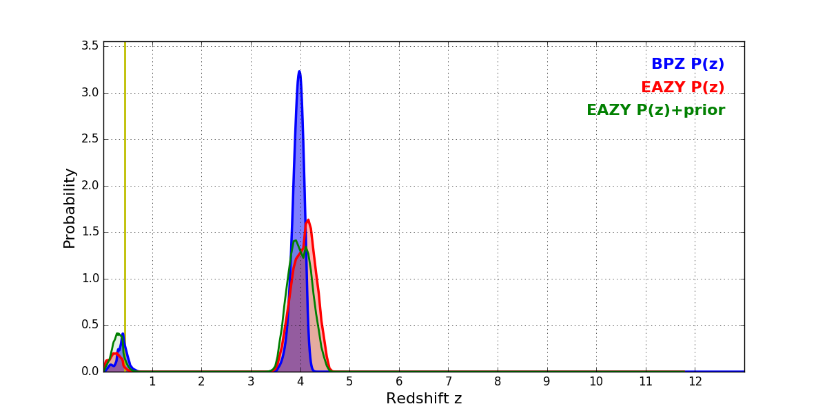 In P(z) plots: Yellow lines mark the cluster redshift z = 0.443,